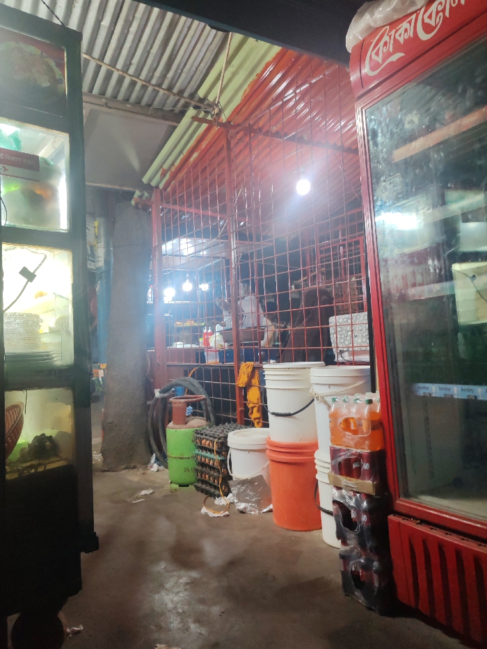 A cluttered outdoor space is shown, adjacent to a building. The area has red metal fencing. A green propane tank sits near egg cartons and several stacked buckets of varying colors. An individual is present inside the building. A Coca-Cola cooler is positioned in the right corner, and a fish tank on the left. The overall lighting is dim, with brighter interior lights visible. The scene suggests a small, perhaps family-run, food business.