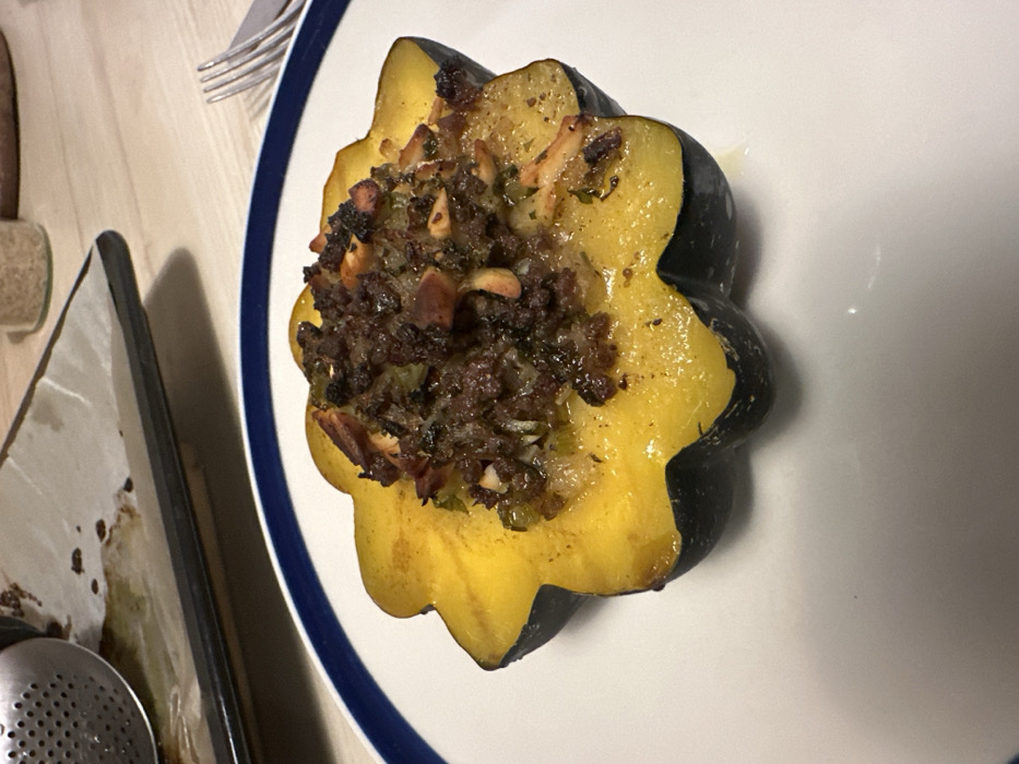 The scene is set indoors, likely a kitchen or dining area within a private residence, city of Unknown, Unknown. The central subject is a single portion of a cooked acorn squash half, presented on a white circular plate with a dark blue rim. The squash exhibits a dark green exterior skin and a bright yellow-orange interior, hollowed and filled with a mixture composed of dark brown, finely textured material, possibly ground meat, combined with lighter colored fragments, including what appears to be chopped nuts and small green elements. The squash's surface shows minor browning, indicative of baking. In the blurred background, to the left of the plate, a dark-colored baking sheet containing a piece of used, crumpled parchment paper with dark residue and a silver-colored slotted spoon is visible. To the right, part of a silver fork and a clear glass shaker containing light-colored granulated material are present. The underlying surface is a light-toned wooden tabletop. No individuals are depicted.