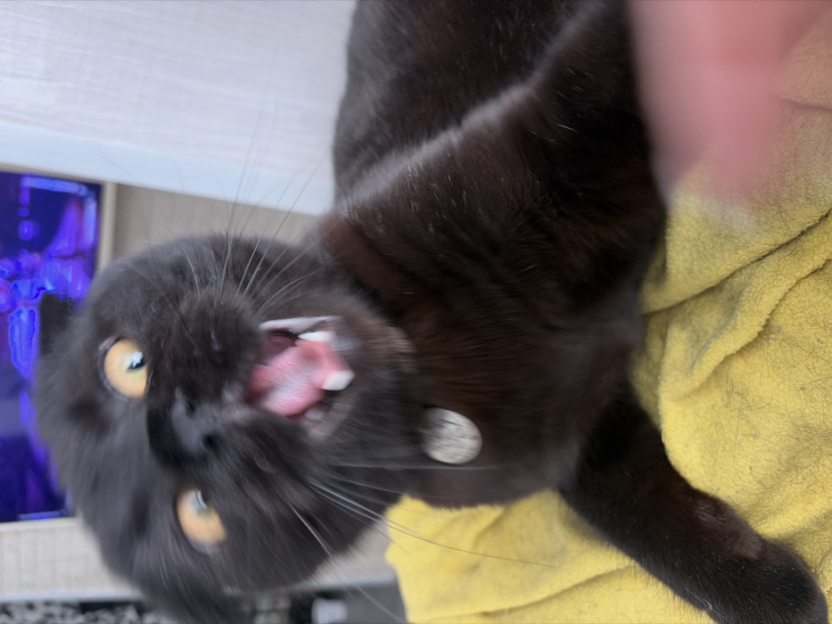 - "The image depicts a black Scottish Fold cat, located in the city of Chaikovsky, Russia, captured with significant motion blur concentrated around its head and open mouth" by FM-rbhEP2, licensed under CC BY 4.0