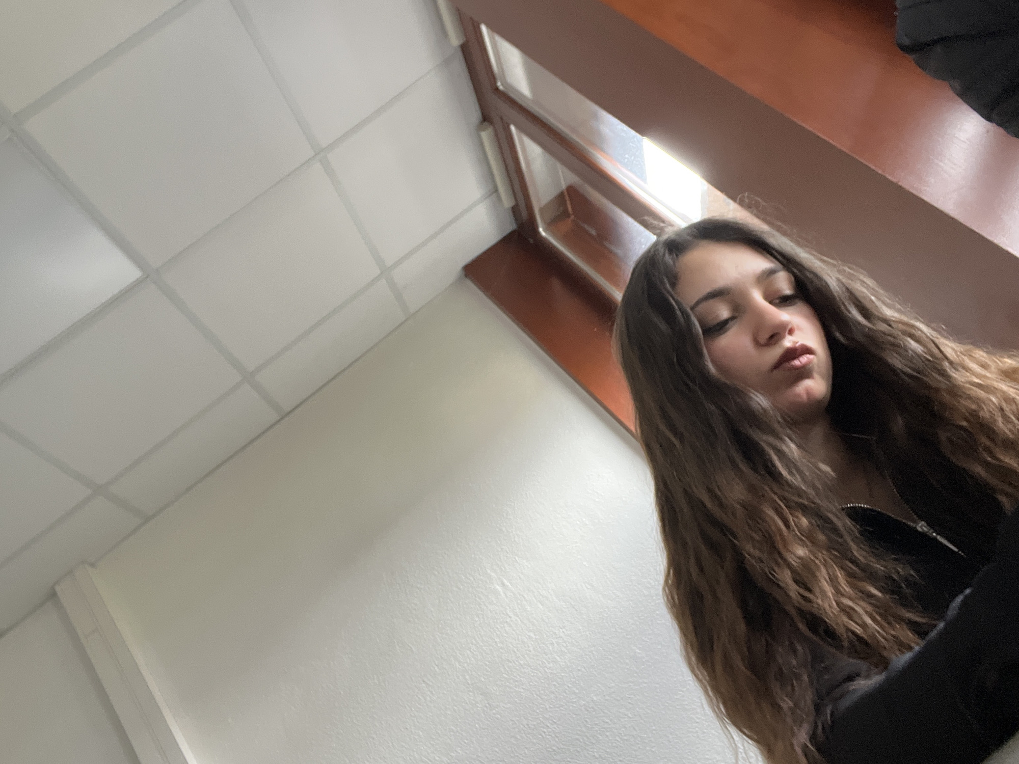 A young woman with long, wavy brown hair looks downward. She wears a black zip-up top. The background includes a white ceiling with square panels, a window frame, and a white wall. The angle is tilted, giving a perspective from below and to the side of the subject. The lighting is bright near the window, casting shadows and highlighting the texture of the hair.