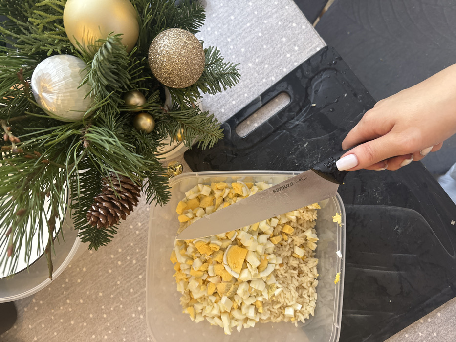 The scene, located in Akulovo (Gp Kubinka), Russia, depicts a domestic surface from an overhead perspective. A clear, rectangular plastic container, approximately 30x20 cm, is positioned on the left, filled with a mixture of cooked light brown rice and diced hard-boiled eggs. A human right hand, featuring white-painted fingernails, holds a "Samura" brand kitchen knife with a black handle. The silver blade of the knife extends into the food container, resting upon the contents. To the upper right, a festive centerpiece is visible, comprising artificial pine branches, a single natural pinecone, and five spherical ornaments: one large textured silver, one large matte gold, one medium glittered gold, and two smaller smooth gold spheres. This decoration rests on a reflective surface. Beneath the hand and knife, a dark, possibly black, cutting mat or surface shows signs of moisture. The underlying surface is covered by a light grey tablecloth with a pattern of small white dots.