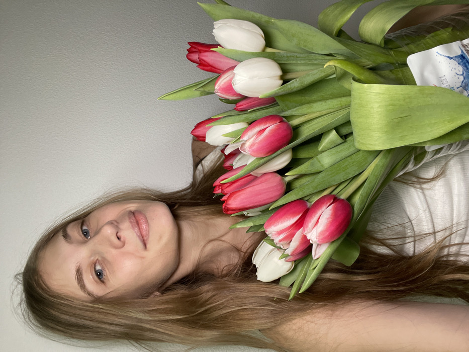 A young adult female is depicted in a close-up, chest-up shot, holding a large bouquet of tulips. She has long, light brown hair, blue eyes, and is looking directly at the camera with a slight smile. She is wearing a white tank top or camisole. The bouquet consists of approximately 15-20 tulips in shades of white, pink, and red, with prominent green stems and leaves. The bottom portion of the bouquet is encased in clear plastic wrapping, which partially obscures a label featuring a blue splash graphic. The background is a plain, light-colored wall, indicating an indoor setting with even lighting. The specific location in the city of Khimki, Russia, cannot be determined from the visual information provided in the image.
