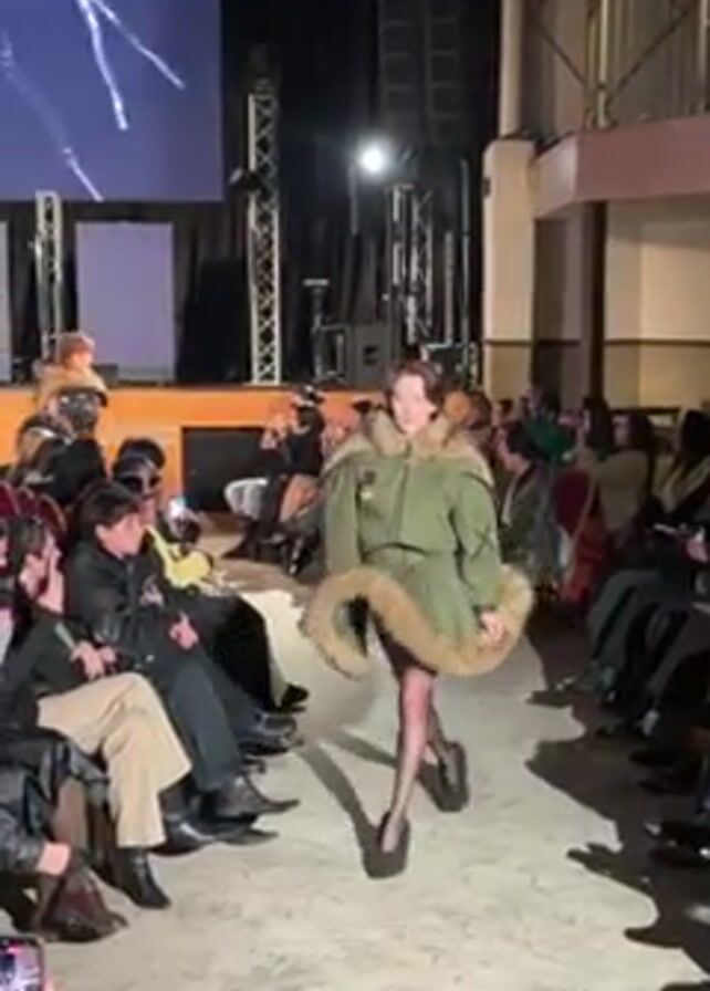 A fashion show runway is depicted in a video clip. On the runway, a female model with short brown hair struts down the runway. She wears a military-style green coat with brown fur lining. The coat is fitted at the top and flares from the waist into a skirt. She also wears black stockings and black platform shoes. In the background, another model walks the runway. This model is wearing a black two-piece set. Both models are moving in the same direction. The audience is seated on either side of the runway, many of whom are recording the show on their phones. The room has high ceilings, a stage, and a screen displaying an abstract image in the background.