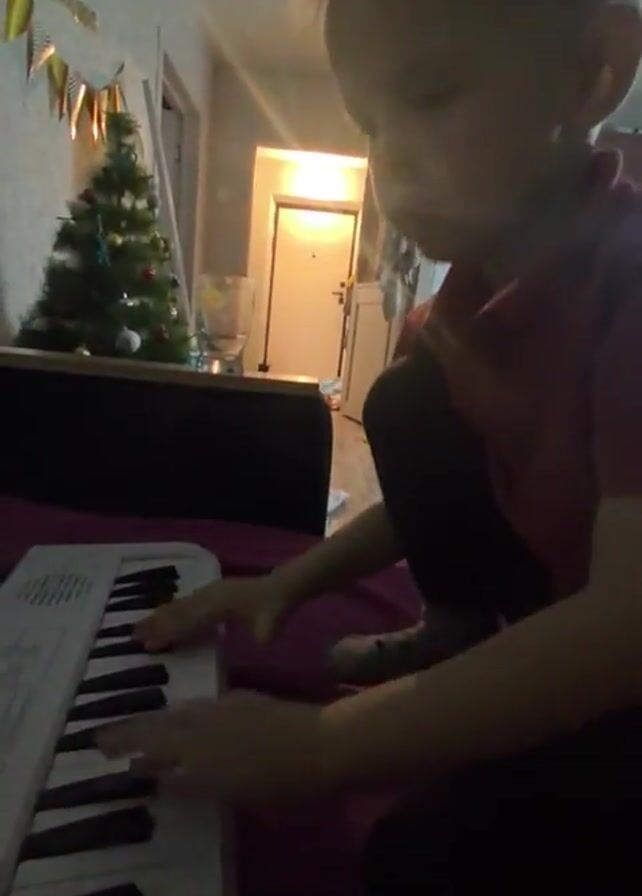 A young boy is squatting on a bed while playing a small, toy keyboard. The keyboard is white with black keys, and it is positioned on the bed in front of him. He is wearing a maroon shirt and dark pants. The bed has a purple blanket. In the background, there is a Christmas tree decorated with ornaments and gold and black triangular flags hanging on the wall. A doorway is visible with the door open, revealing a hallway with a light on. The light is shining directly into the camera.