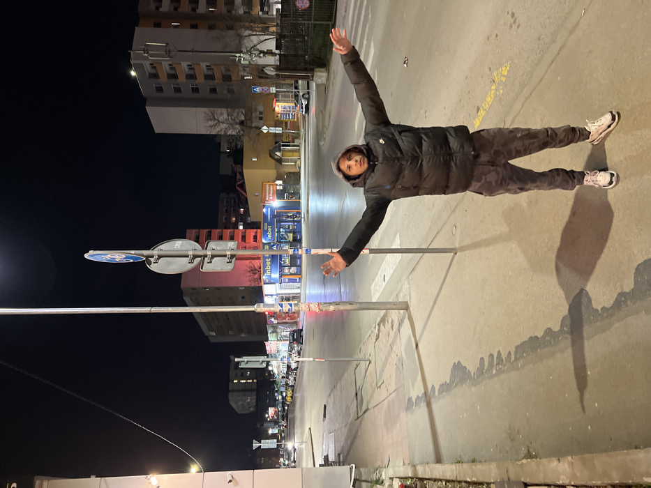 The image depicts a nighttime urban scene on Bulevard "Konstantin Velichkov" 123, Sofia, Bulgaria, with the perspective looking northeast. A young male individual stands centrally on a wet concrete sidewalk, facing the camera. He wears a dark puffer jacket with the hood up, dark camouflage-patterned trousers, and light-colored athletic sneakers. His arms are outstretched horizontally to his sides, palms open and facing upwards, while he maintains direct eye contact with the camera. To the subject's left, a light-colored building with two visible surveillance cameras marks the edge of the frame. The sidewalk exhibits varying degrees of wetness and faint ground markings. Beyond the sidewalk is an asphalt road, also wet, featuring white zebra crossing stripes and a faded yellow road marking. Multiple metal poles are present, one prominently displaying a circular blue sign indicating "Cyclists only." Across the street, a commercial strip is visible. Two "inbet" betting shops are prominent, marked by illuminated blue and yellow signs. Adjacent to these, a storefront displays Cyrillic text reading "Аптека & Супермаркет" (Pharmacy & Supermarket). Behind these establishments, a distinctive yellow-orange building with a dark roof structure is present. Further down the street, a multi-story building section is illuminated with red light. In the background, several dark, multi-story apartment or residential buildings are silhouetted against the dark sky. Artificial streetlights and illuminated commercial signs provide primary illumination, casting the subject's shadow on the sidewalk behind and to his left, and creating reflections on the wet road surface. Several parked and distant moving vehicles are also visible on the street.