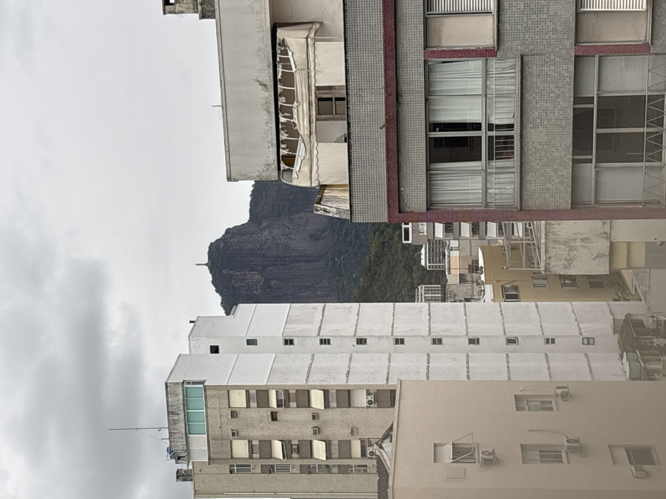 n overcast cityscape, featuring several multi-story buildings in the foreground. The buildings vary in architectural style and color. In the background, a mountain dominates the horizon, and the Christ the Redeemer statue stands atop. The sky is a uniform gray.