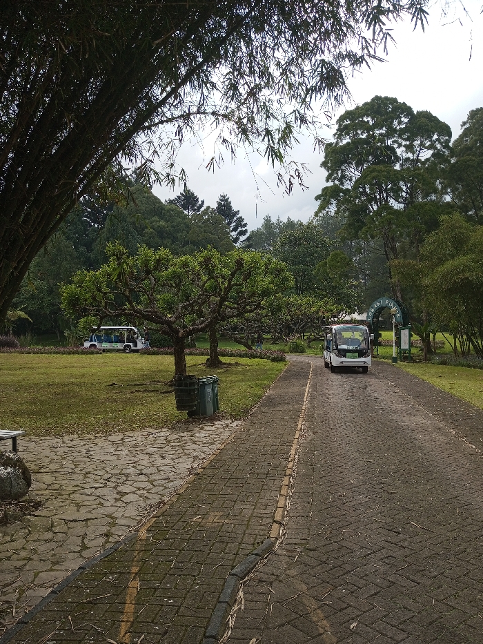 A paved road leads into a park-like setting. Green grass, trees, and shrubs line the road. A small, white vehicle drives on the road while another is parked on the grass. A black bamboo structure is visible on the left. The sky is overcast, and the scene appears to be in a slightly misty or rainy environment. Two green trash cans stand near a tree by the road.