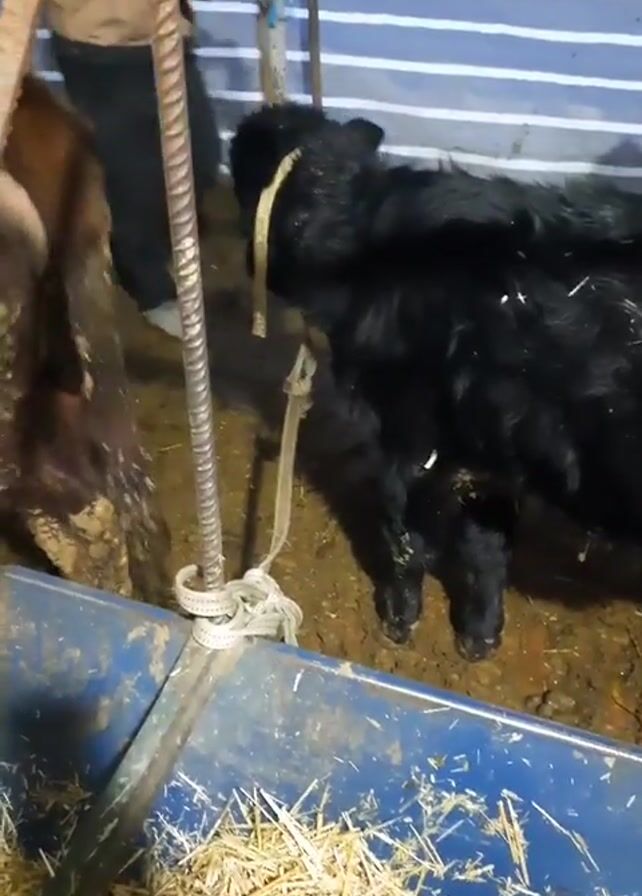 three cows in a pen. One cow is brown, one is black and one is brown and white. The cows are standing in a muddy pen with straw on the floor. A blue and red feeder is filled with hay. A person in a brown jacket and black pants is standing near the cows, but their face is not visible. The pen has blue and white striped walls. The camera moves slightly throughout the video.