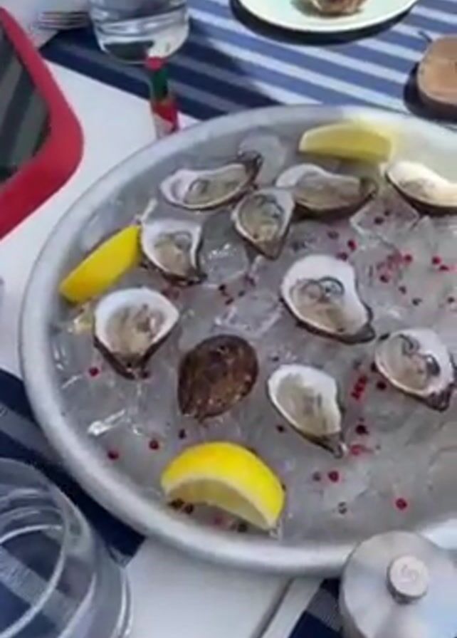 table at an outdoor restaurant in Malibu. On the table is a tray of oysters on ice with lemon wedges and tiny red peppercorns, small bottles of Tabasco sauce, a shaker of salt and pepper, glasses of water, and a small plate with a half of what appears to be a deviled egg. Another plate has a pile of fried calamari served with small dishes of sauces. A woman is seen adding sauce to her calamari. A glass of white wine is also on the table. The table is covered with a blue and white striped tablecloth. In the background, the ocean can be seen. The sky is clear and blue. The ocean waves crash on the rocks.
