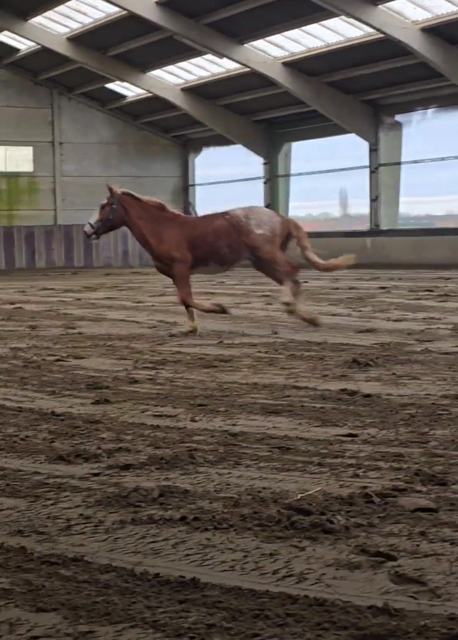 horse galloping in an indoor riding arena