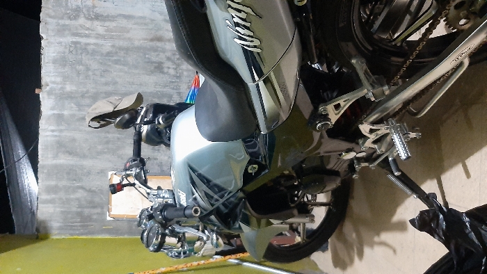 This image depicts a silver and black Kawasaki Ninja motorcycle parked indoors in Gampongjawa, Indonesia