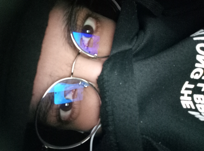 A person's face is close to the camera. They are wearing silver-rimmed glasses with blue reflections. The person's eyes are wide open, looking straight ahead. Part of a black hooded sweatshirt is visible, with white text partially displayed. The image is taken at an unusual angle.