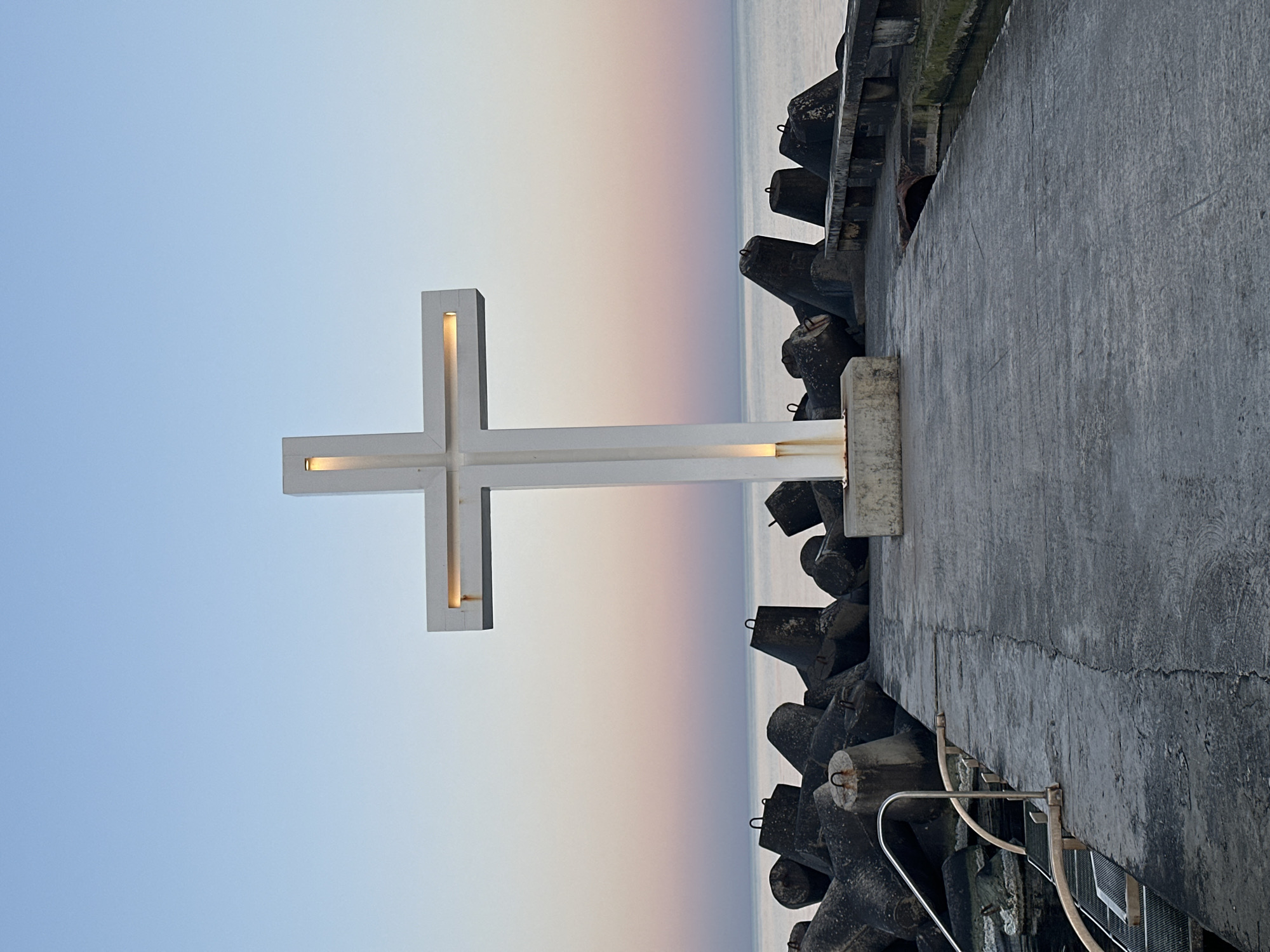 A low-angle, sideways shot depicts a large, white, illuminated cross standing on a concrete pier in Varna, Bulgaria. The cross is positioned on the left side of the frame. The pier is on the right side, extending towards the water. Concrete tetrapods line the edge of the pier. The background consists of a pastel sky gradient, transitioning from blue to pink near the horizon. The sea is visible in the background. A metal railing is attached to the side of the pier.
