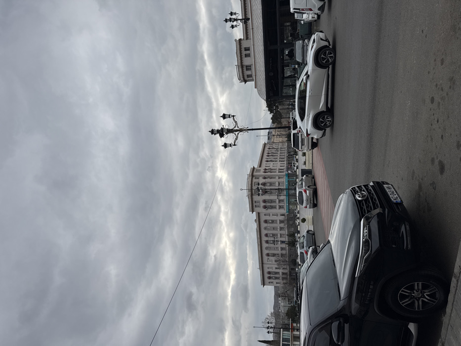 The image captures an urban street scene in Rustavi, Georgia, under a uniformly overcast sky