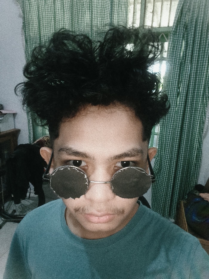 The scene depicts a male subject in an indoor residential setting in Lhokseumawe, Indonesia. The subject is positioned centrally, directly facing the camera. He has dark, voluminous curly hair styled upwards, a thin mustache, and dark eyes visible above his eyewear. He is wearing a teal-colored crew-neck t-shirt. The subject wears round, silver-rimmed sunglasses with dark, opaque lenses; the left lens (from the viewer's perspective) exhibits an irregular, fractured lower edge. The background on the right features a green and white checkered curtain, partially covering a window with vertical security bars. On the left, a dark, indistinct object, possibly furniture, is partially visible, with metallic structural components beneath it. Illumination suggests ambient indoor light supplemented by natural light from the obscured window.