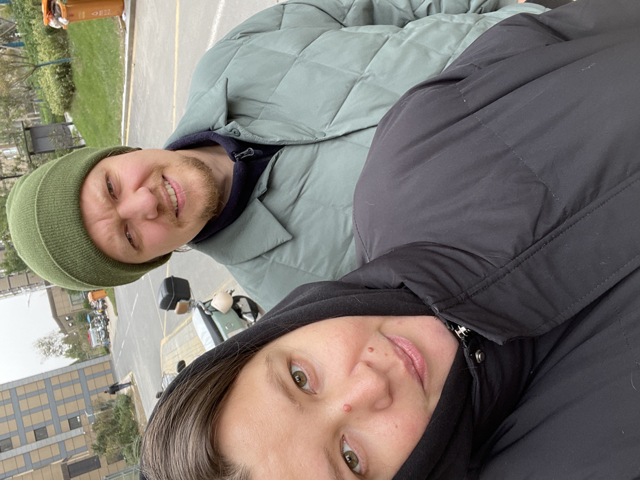 The image depicts two individuals, a female and a male, in a selfie-style composition outdoors in Jinshui District, China. The female, positioned in the foreground and to the left, has light brown hair, olive-green eyes, and visible skin tags/moles on her nose and right cheek. She wears a black puffer jacket with a raised collar and hood, gazing directly at the camera with a neutral expression. The male, positioned behind and to the right of the female, has light brown hair, a patchy beard, and wears an olive-green knit beanie, a dark blue zipped fleece, and a light green diamond-quilted jacket. He is smiling and looking towards the camera. In the background, an urban environment is visible. A light green electric scooter with a black top case is parked on the asphalt road between the subjects and the distant structures. The road features white markings and a yellow curb. To the far right, two orange public trash cans stand on a grassy verge. Beyond the road, multi-story residential buildings with square windows and a grid-like facade are visible under an overcast, light gray sky. Sparse trees and green spaces line the roadside. A lone figure is faintly visible walking on the pavement in the distant background to the left.