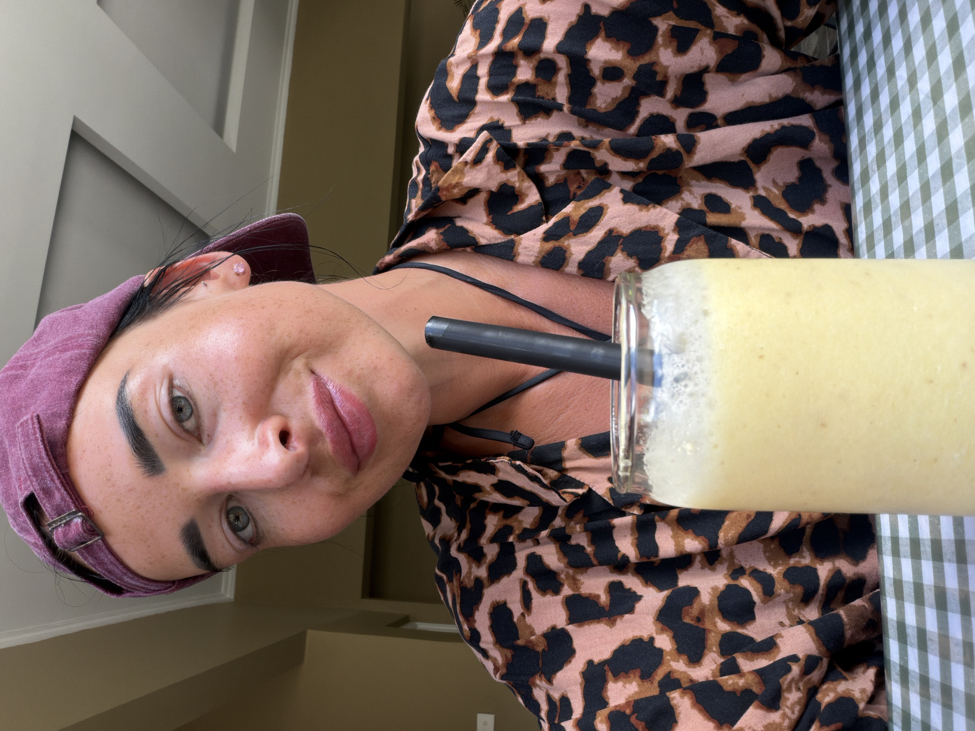 A woman with fair skin, dark eyebrows, and green eyes is wearing a mauve cap and a dress with a brown and black animal print pattern. She is positioned next to a tall glass filled with a yellow smoothie and a black straw. The glass is resting on a green and white checkered surface. The background includes a beige wall and a white architectural detail. The image does not contain information that would imply the location is in the city of Ungasan, Indonesia.