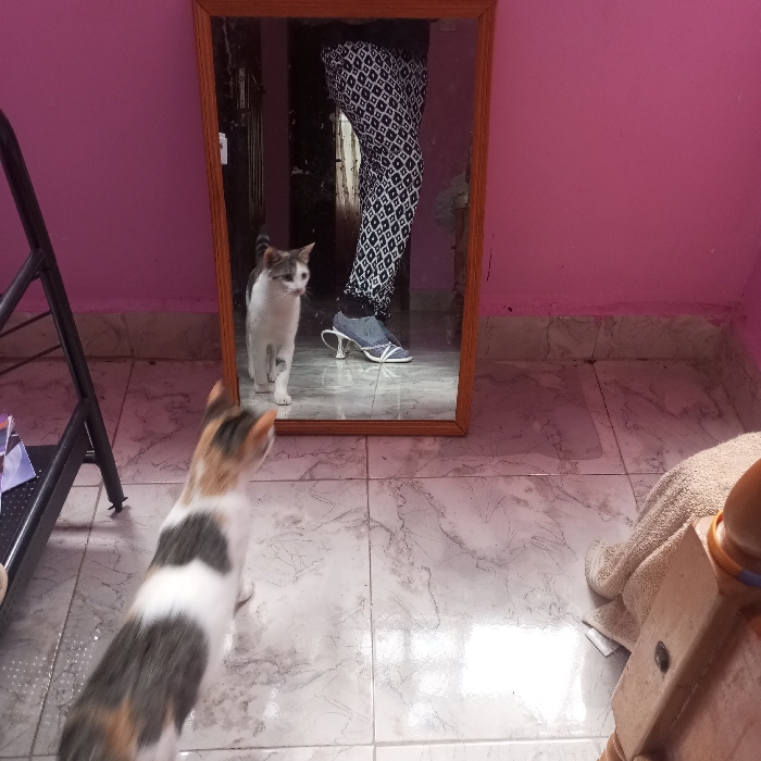 The scene, located in Mahiakalo ward, Kenya, is an indoor view featuring a wooden-framed mirror leaning against a pink wall on a light-colored tiled floor. Reflected within the mirror are the lower legs of a person wearing black and white patterned trousers and one blue-gray heeled shoe with white accents. A white and gray tabby cat is also visible in the reflection, walking towards the reflected person's foot. In the foreground, a calico cat with white, orange, and gray markings is positioned with its back to the viewer, looking directly at the mirror. To the left, a black metal shelving unit is partially visible. To the right, a wooden furniture element draped with a beige towel is present.