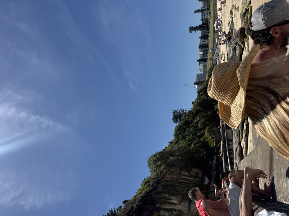 A beach scene with a bright blue sky. In the foreground, people sit and relax, one wearing a red shirt and another with exposed feet. A woman in a straw hat stands with her back to the camera. A rocky cliff covered in green foliage rises in the middle ground. In the background, a sandy beach is visible with people sunbathing, alongside buildings and trees along the coastline.
