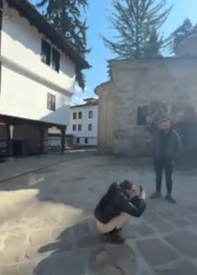 courtyard with stone paving surrounded by buildings. A person is crouched, taking a photograph of a man standing in the courtyard. The camera pans and other people are seen walking across the courtyard. The day is sunny. The architectural style of the buildings appears historical.