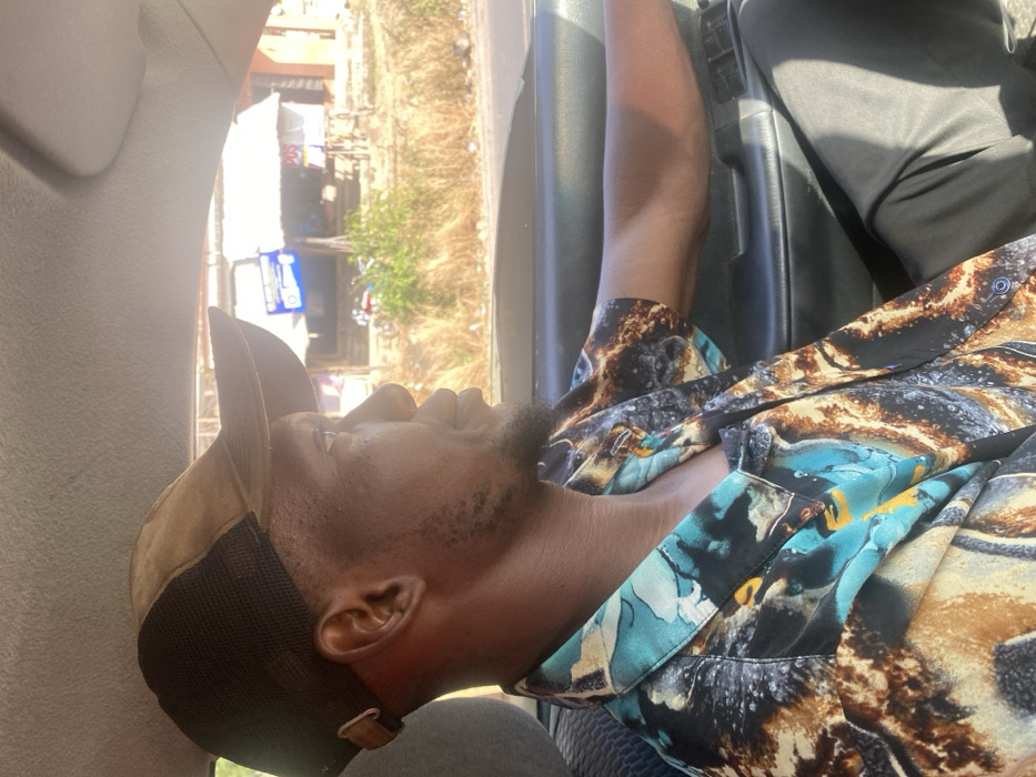 A dark-skinned male, positioned as the driver, is captured from the mid-chest upwards inside a vehicle in Ozuri, Nigeria