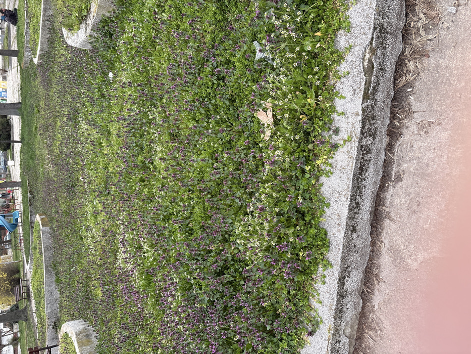 The image depicts a public green space located within a city park in Dimitrovgrad, Bulgaria. In the immediate foreground, a weathered concrete curb separates a pinkish-grey paved walkway from a raised garden bed. This bed, bordered by low, light-grey concrete retaining walls, is densely overgrown with green plants interspersed with numerous small purple flowers and clusters of white flowers. A single dry, light-brown leaf is visible on the foliage near the center-right, and a crumpled white plastic item is partially obscured further right within the plant growth. Beyond this planted area, the background reveals further park elements. Several deciduous trees with dark trunks stand, mostly bare of leaves. A blue and yellow children's slide structure is centrally located in the mid-left background. Two wooden park benches are present; one is on the left, occupied by a seated individual. Another individual, dressed in dark clothing, is seated on a surface in the far-right background. In the distant background, faint outlines of parked vehicles and urban structures are visible, suggesting proximity to a street or residential area. The scene is illuminated by natural light, indicating daytime.