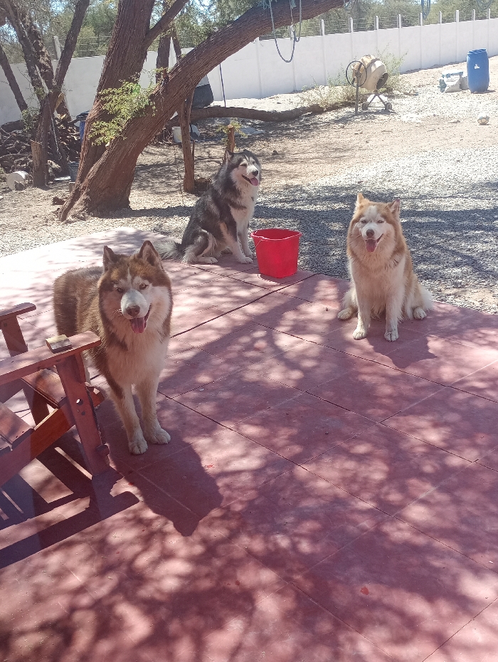 Three dogs, identified as Huskies, are positioned in an outdoor yard in Pozo Almonte, Chile, under direct sunlight