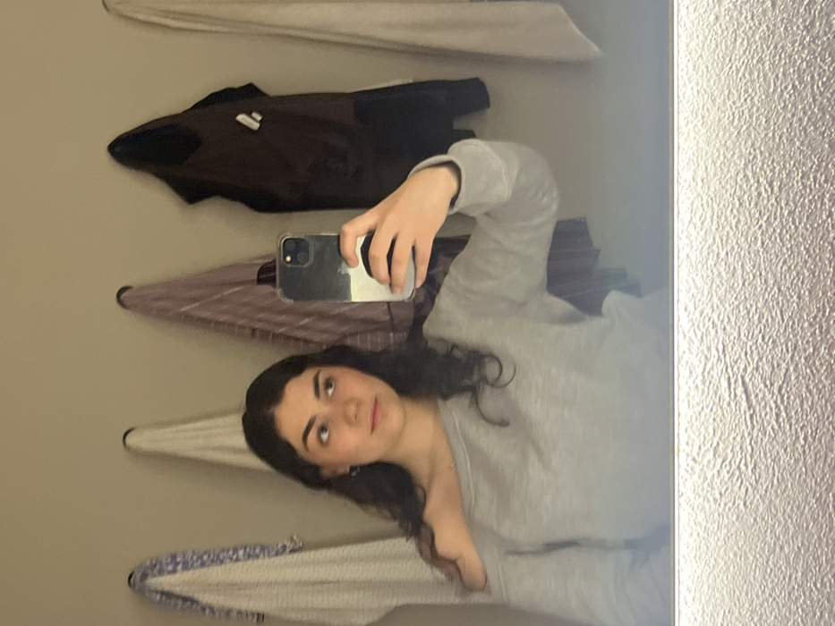 A young woman in a grey sweatshirt takes a selfie in a mirror