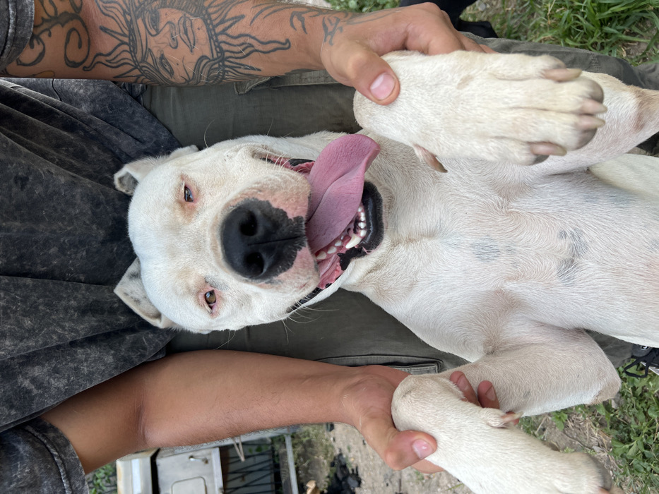 A white dog with black spots is lying on its back, being held by a person with tattoos on their arm. The dog has a large pink tongue hanging out of its mouth, and its paws are being held. The person is wearing a grey patterned shirt and khaki pants. The background shows a glimpse of a white vehicle and some green grass.