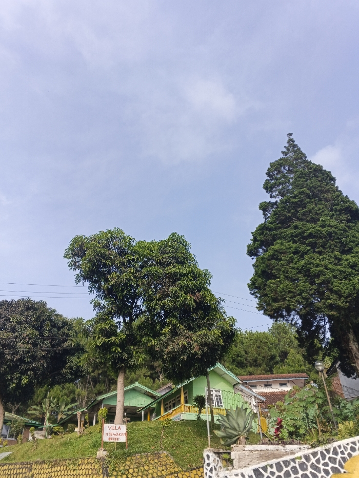 The scene is located in the city of Basedth, Cambodia, under a light blue sky with minimal scattered cirrus clouds. The foreground features a decorative retaining wall composed of yellow rectangular panels outlined in black, topped by a white section with irregular black patterns. A lush, grassy embankment rises behind this wall. Situated on the embankment are multiple bungalow-style structures, predominantly light green with yellow railings on porches or balconies and white-framed windows. A large deciduous tree with dense green foliage stands centrally in the mid-ground, partially obscuring one of these bungalows. To the right, a tall, dense evergreen tree with a conical silhouette extends into the upper frame. In the background, higher on the slope, a multi-story building with a light-colored facade and a red-tiled roof is visible. Utility lines span horizontally across the mid-ground. A dark lamppost stands on the far right. A red rectangular sign, partially obstructed by a tree trunk, displays white text that reads 'VILLA H SEWAKAN' with additional, smaller text below it. No individuals are present. Various shrubs and succulents are integrated into the landscaping around the structures.