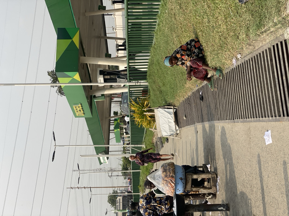 A scene at a "DIESEL" gas station, featuring a paved area with people and structures. At least three people are present, one sitting by the gas station's grass border near a drainage grate. Another person stands near a cart loaded with goods covered with a plastic wrap. Electrical pylons stretch along the horizon. The setting seems to be a busy roadside location.