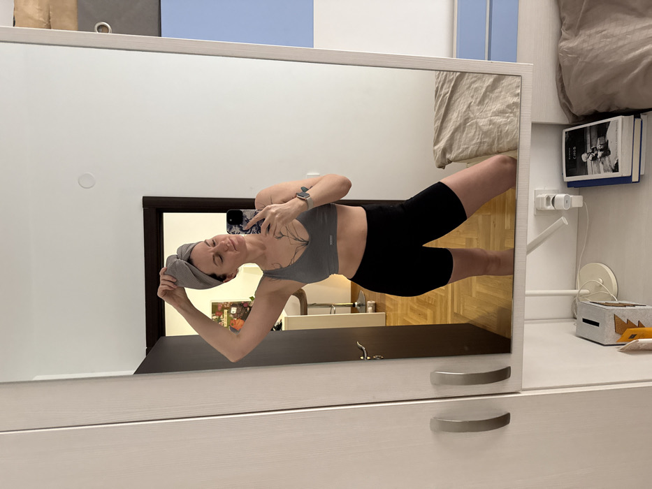 A female subject is depicted in a mirror selfie taken indoors. She wears a gray sports bra, black athletic shorts, and a gray textured hair towel wrapped around her head, which she holds with her raised left hand. A tattoo is visible on her sternum, and a light-colored smartwatch with a butterfly clasp adorns her left wrist. She holds a dark-colored smartphone with a patterned case in her right hand, positioned for the selfie, eyes closed, and exhibiting a serene expression. The mirror is integrated into a white wardrobe, visible with two vertical light-colored handles on its left. To the right of the mirror, a white wall is present. Below the mirror, a white desk or shelf contains a white flexible-arm desk lamp, a small white rectangular box with orange items, a white power adapter with a USB-C port, and a stack of books, the top one titled "CHOB" (likely "Снов" in Cyrillic) featuring an image of a child. To the right, a bed covered with a beige crumpled duvet and a blue and white furniture unit are visible. Reflected through an open dark-framed doorway behind the subject is another interior space, featuring light wooden parquet flooring, white walls, a white cabinet, and a wall decoration. This scene is situated within a residential interior in Boreti, Montenegro.