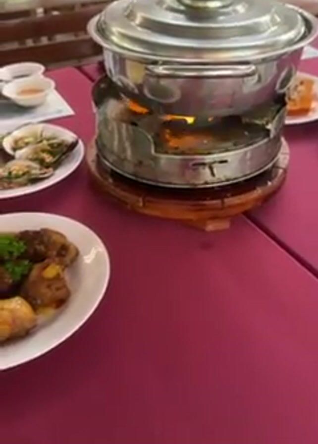 table set with a burgundy tablecloth. There are several plates of food, including one with chicken pieces garnished with parsley, and another with clams or oysters topped with chopped nuts and herbs. In the center of the table is a stainless steel pot sitting on a heating device with a lit flame underneath. There are other dishes and condiments scattered around the table. Wooden chairs surround the table, and people are visible in the background, suggesting a restaurant or dining setting.
