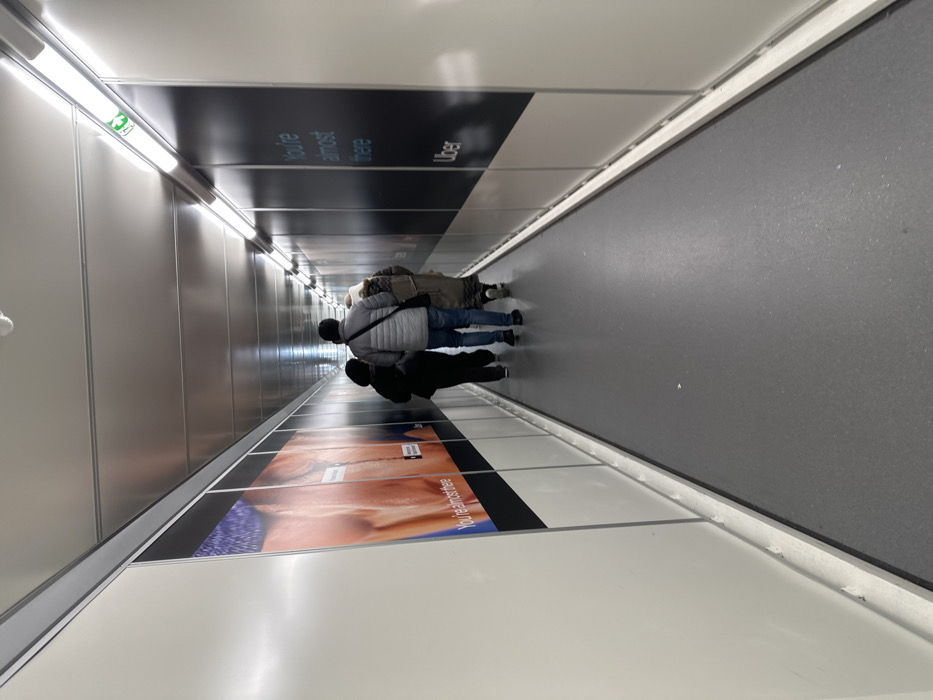 Two people are walking down a hallway. The hallway is long and narrow. The walls are lined with advertisements, including an advertisement for Uber. The hallway has a gray floor and white walls. The ceiling is also white and has fluorescent lights. The first person is wearing a gray jacket and jeans, and the second person is wearing a black jacket and black pants. There is one more person in the distance carrying some baggage.