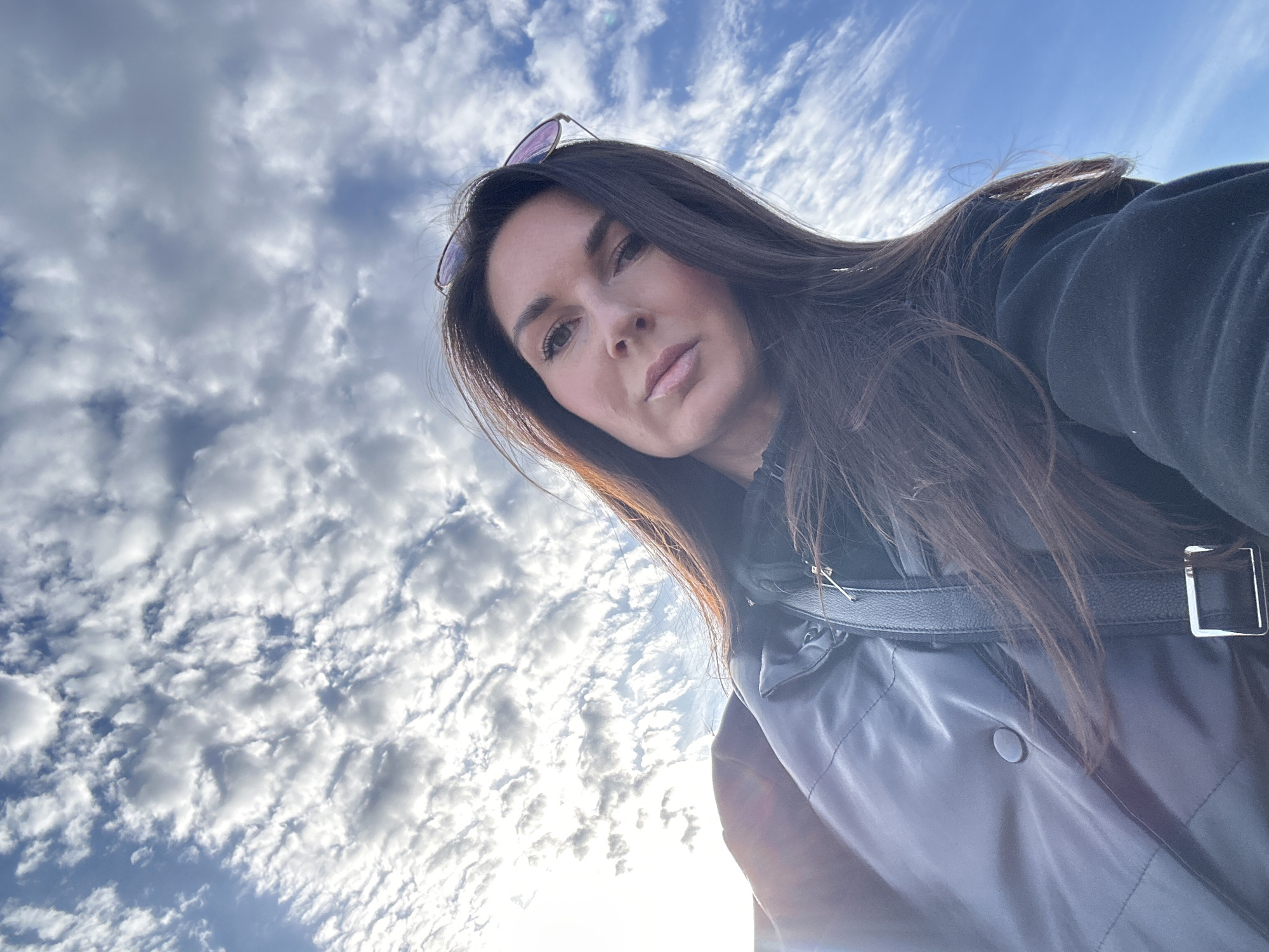 The image displays an adult female in a low-angle, selfie-style outdoor photograph, taken in daylight, within the city of Chaikovsky, Russia. The subject occupies the lower and central portion of the frame, looking directly at the camera. She has long, dark brown hair, which appears to be slightly disturbed by wind, and purple-tinted sunglasses are resting on top of her head. She is dressed in a dark, possibly black or navy, puffer jacket featuring a visible button on the front, over a dark undershirt. A black leather shoulder bag with a metallic buckle is visible over her left shoulder. The background is composed of a clear blue sky interspersed with numerous white and grey altocumulus clouds. A strong light source, indicative of the sun, is visible in the upper left portion of the sky, creating lens flare and backlighting the subject. No specific identifiable location or landmark within Chaikovsky is discernible in the background.