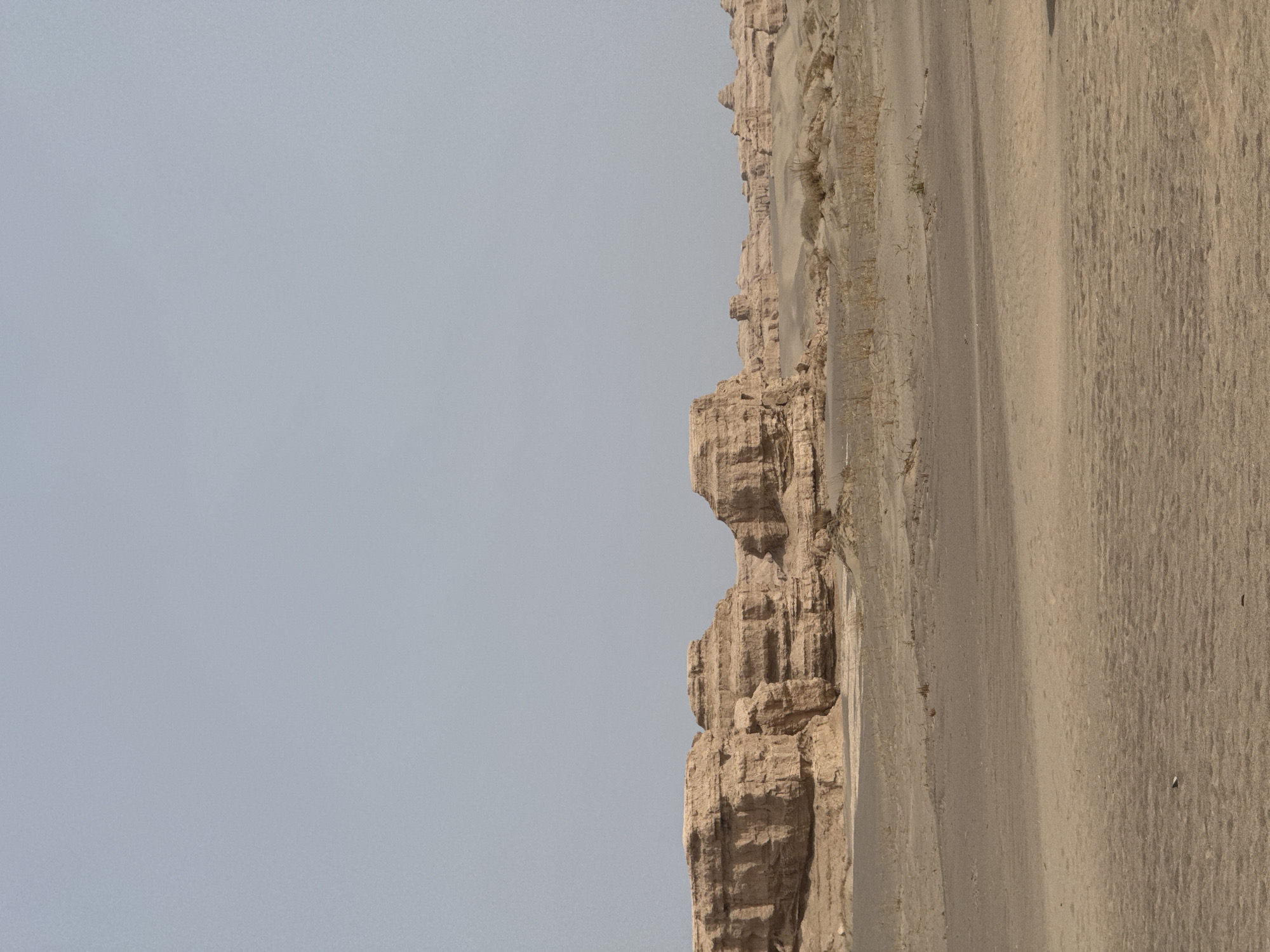 geological formation in Dunhuang City, China. The formation is composed of layered rock with a heavily eroded surface, abutting a sandy slope. The sky is overcast and uniformly grey. There are no signs of human or animal activity in the frame.