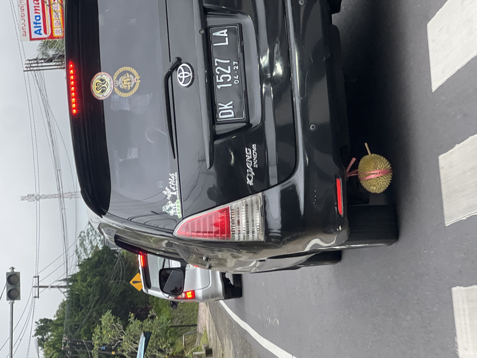 The scene depicts a rear view of traffic on an asphalt road in the city of Mekarsari, Indonesia, under an overcast sky. In the foreground and center, a black Toyota Kijang Innova is stationary or moving slowly in a traffic lane. Its rear license plate is "DK 1527 LA," with "04-27" inscribed below it. The vehicle features a rear spoiler with an integrated high-mounted stop lamp, two distinct circular emblems (one silver, one gold-toned) affixed to the upper portion of the rear window, and a "BALI SAFARI" sticker alongside a smaller "L'ALS" sticker on the lower left of the rear window. A single durian fruit, bound with pink string and a wooden stick, is suspended from the underside of the vehicle's rear bumper on its left side. Ahead of the black Innova, a silver-colored SUV, with its brake lights illuminated, is visible in the same lane. The road surface includes a solid white line marking the right edge of the traffic lane and partial white pedestrian crossing stripes in the immediate foreground. The surrounding environment consists of utility poles and overhead power lines on the left, dense green foliage, a distant yellow triangular warning sign, and an overhead traffic light signal with two dark circular lights. An "Alfamart" store sign is partially visible in the upper right background.