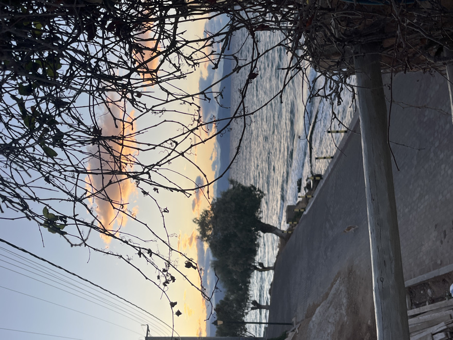 An outdoor scene captures a coastal view in Megalochori, Greece, during either sunrise or sunset