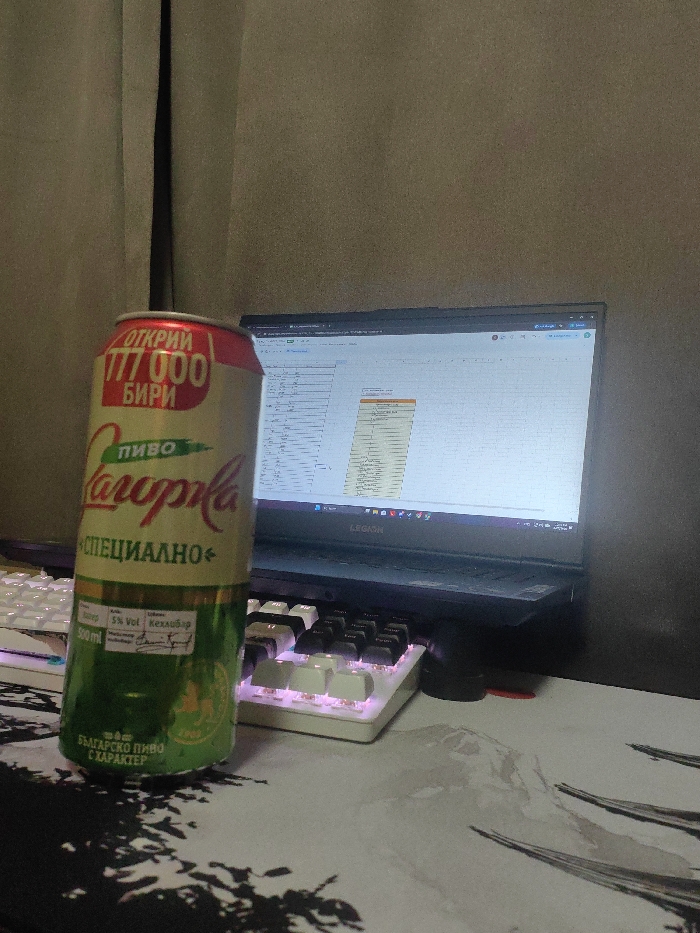 An indoor scene depicts a desktop setup. A 500ml can of "Zagorka Спезиално" beer, a Bulgarian brand, stands upright in the foreground, centered. The can features green, white, and red coloring with Cyrillic text, including "ОТКРИЙ 777 000 БИРИ" (Discover 777,000 Beers) at the top, and "5% vol." The beer can is positioned on a light-colored mouse pad with a black and white graphic design, possibly depicting abstract mountains or ink strokes. Behind the can, a black Lenovo Legion laptop is open, displaying a spreadsheet application, likely Microsoft Excel or Google Sheets, with numerical and textual data visible on its illuminated screen. To the left of the laptop and slightly in front, a white mechanical keyboard with backlit pink/purple keys is visible. The background consists of a plain, light beige or tan curtain, partially obscuring a dark vertical line or seam on the left. No individuals are present. The setting appears to be a personal room or office within Sofia, Bulgaria, consistent with the identified Bulgarian beer brand.