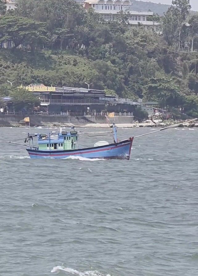 A medium shot depicts a blue and green boat sailing left to right on a wavy body of water
