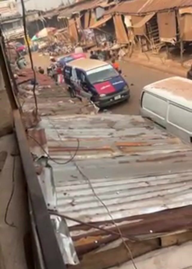 street in a local market in Enugu, with a van parked in the street, next to a white van. The surrounding structures consist of old, corrugated metal buildings, with overhead wires crisscrossing above the street. People are seen moving along the street. The video is shot from an elevated position, possibly a rooftop or upper floor of a building, with a view obstructed by corrugated metal.