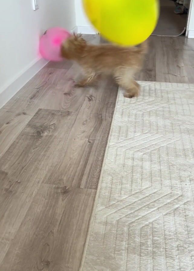In a well-lit interior space, a small, light brown, fluffy dog excitedly chases two balloons, one pink and one yellow, across a light-colored, wood-look floor