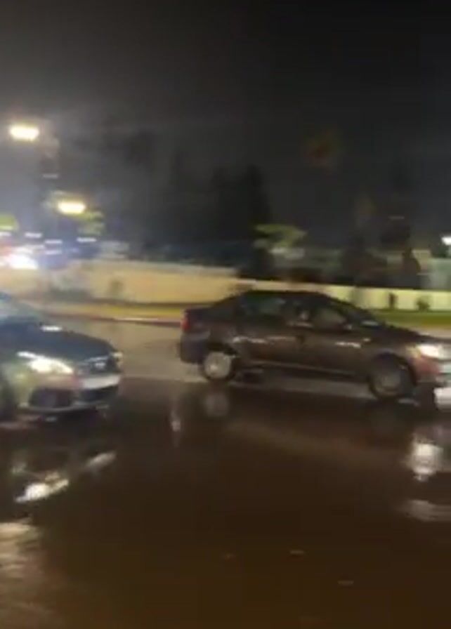 cars driving on a wet road at night, with reflections of the car lights and street lights visible in the puddles