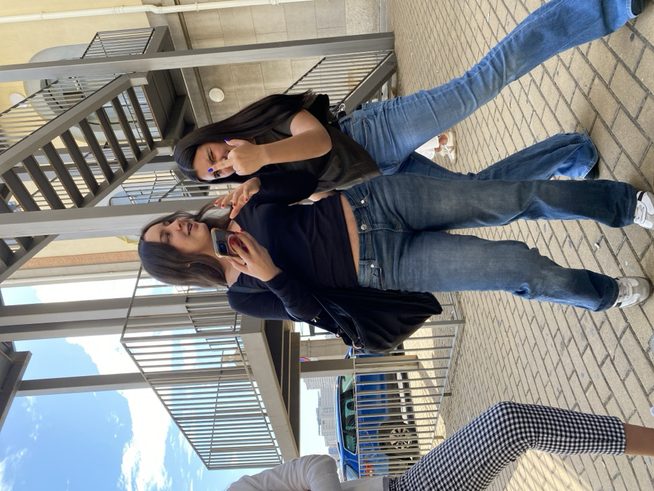 The image displays an outdoor urban scene in an unidentified city, featuring three individuals and portions of a fourth on a paved walkway adjacent to a building, under a blue sky with scattered clouds. A young female, positioned centrally, has long dark hair and wears a black long-sleeved midriff top, blue bootcut jeans, and white-and-grey sneakers. She holds a gold-cased smartphone in her left hand with red nail polish, and her right hand is open in a gesture, her mouth slightly open. A black shoulder bag is slung over her left shoulder. To her right, a second young female with long dark hair, wearing a dark top, blue bootcut jeans, and light-colored flat shoes, directs a middle finger gesture with her right hand towards the viewer. Her eyes are squinted, and her lips are slightly pursed; her nails are purple. The lower half of a third person, wearing a white top and black-and-white checkered pants, is visible on the far left. The lower legs of a fourth individual, in white pants and light shoes, are partially seen behind the second female. The background comprises a light-colored multi-story building with a grey metal external staircase on the right and a cantilevered walkway with railings on the left. A grey metal fence is positioned parallel to the walkway, behind which a blue SUV is parked. Distant buildings are discernible against the sky. The ground is covered with light-colored rectangular pavers.