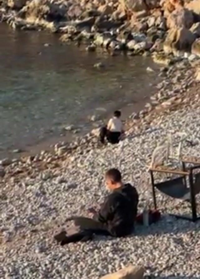 rocky beach with two people on it. One person sits on the beach near a metal folding chair, facing away from the camera, with their legs extended, looking at something in their lap. A red and black water bottle sits nearby. The second person, a child, is near the edge of the water, also facing away from the camera. The beach is made up of small, light-colored rocks. The water is clear and calm. A rocky hillside covered in green vegetation rises behind the beach. The sky is clear and blue. The camera pans slightly upwards.