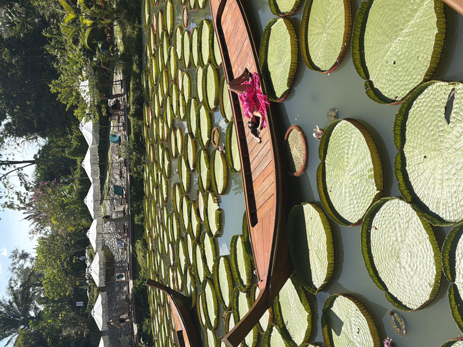 A tranquil scene shows a pond filled with giant water lilies. A wooden boat floats amidst the lily pads, carrying a woman in a bright pink dress and her pet, presumably a dog. The woman reclines in the boat. On the shore, white umbrellas line a path. Lush greenery borders the pond, framing a relaxing resort-like setting.
