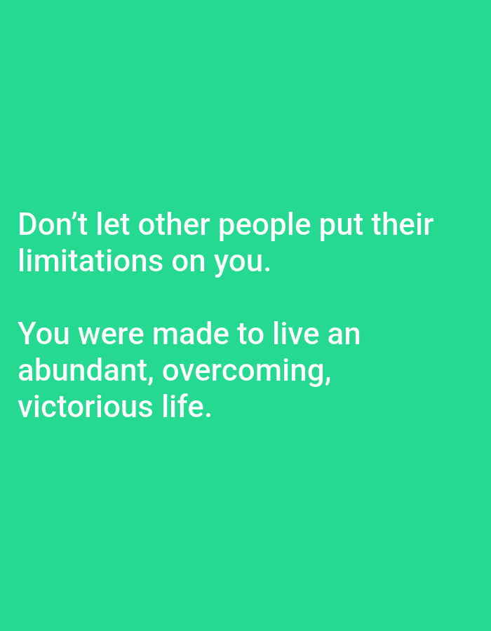 The image displays a motivational quote against a solid green background. In white text, the message states, "Don't let other people put their limitations on you." Following this, it adds, "You were made to live an abundant, overcoming, victorious life." The overall tone is encouraging, promoting self-belief and resilience.