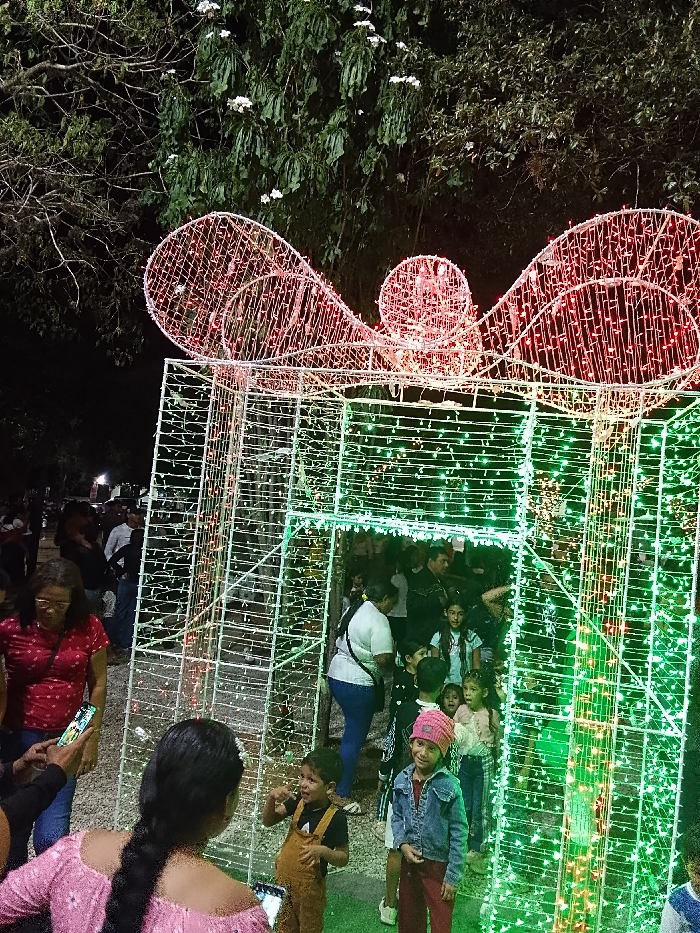 - "A large, lighted, gift-wrapped box structure stands in a public area" by FM-SrAiG2, licensed under CC BY 4.0