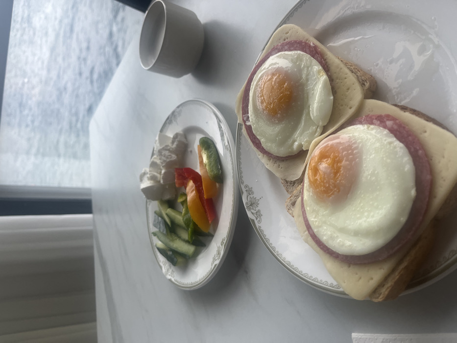 An overhead, slightly angled shot captures a breakfast or brunch setting on a white, possibly marble, table located indoors in Saint Paul's Bay, Malta. The scene is positioned next to a large window, revealing a view of choppy, blue-grey sea water beyond. Vertical white blinds are partially visible to the left of the window frame. In the foreground, a white ceramic plate with a grey and gold patterned rim holds two open-faced sandwiches. Each sandwich consists of a slice of dark bread, topped with a rectangular slice of light yellow cheese, a circular slice of salami, and a fried egg with a firm white and a prominent orange yolk. Further back and to the left, a second identical ceramic plate contains a side dish. This plate holds several slices of green cucumber, red bell pepper, yellow bell pepper, and dark green pepper, alongside multiple irregularly shaped chunks of white cheese. To the right of the second plate, a small, white, cylindrical cup or mug containing a clear liquid, likely water, is visible. A sliver of a white napkin or tissue is present on the far left edge of the foreground plate. No individuals are visible in the image.