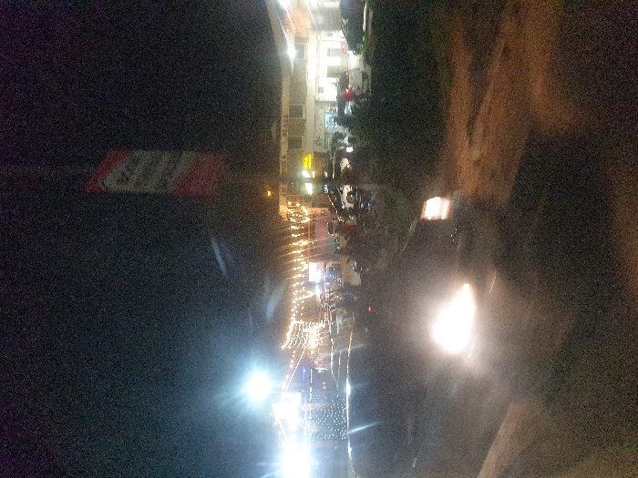 Nighttime street view with bright lights illuminating businesses and pedestrians. Garlands of lights stretch along the street. In the foreground, a car's headlight is intensely bright. A sign with a red and white pattern is partially visible on the left. The right side of the frame is darker, suggesting a roadside area. The overall scene is lively and active, characteristic of a busy commercial area after dark.